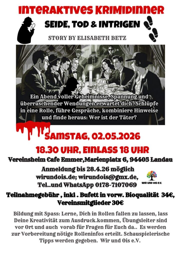 🎭 Krimidinner 1968 – „Seide, Tod & Intrigen“ Story made by Elisabeth Betz Ein Abend voller Geheimnisse, Begegnungen und überraschender Wendungen erwartet Euch: Taucht ein in die Welt einer Münchner Textildynastie im Jahr 1968. Die einflussreiche Familie von Aidenbach lädt zum festlichen Geburtstagsdinner – doch hinter der eleganten Fassade verbergen sich Spannungen, ungelöste Konflikte und eine Vergangenheit, über die lieber geschwiegen wird. Als der Seniorchef plötzlich tot in seinem Büro aufgefunden wird, beginnt ein intensives Spiel: 👉 Wer hat ein Motiv? 👉 Wer verschweigt etwas? 👉 Und wer sagt die Wahrheit? Du schlüpfst in eine eigene Rolle, führst Gespräche, beobachtest, kombinierst und wirst Schritt für Schritt Teil einer Geschichte, die sich nur durch Dein und Euer Mitwirken entfaltet. Für Anfänger und Fortgeschrittene gleichermaßen geeignet. Als Verein haben wir uns weiterentwickelt und dieses Krimidinner eigenständig konzipiert sowie die Organisation und Spielstruktur weiter verfeinert. 👉 Dadurch können wir gezielter Lerneffekte, das Erkennen von Zusammenhängen, das Miteinander und die Interaktivität fördern. 👉 Viele persönliche Kompetenzen können dabei sichtbar werden und sich entfalten. Im Mittelpunkt stehen dabei nicht nur Spannung und Rätsel, sondern vor allem: 👉 gemeinsames Erleben 👉 Austausch 👉 und Freude am Spiel ⸻ 📍 Ort: Vereinsheim – Café Emmer Marienplatz 6 94405 Landau an der Isar ⸻ 💶 Teilnahmegebühr: 34 € pro Person (inklusive Buffet), Vereinsmitglieder 30 €, inkl. Bufett. ⸻ 📅 Anmeldung & Informationen: 📞 Mobil / WhatsApp: 0178 7107069 (Elisabeth Betz) 📧 E-Mail: wirundois@gmx.de 🌐 Website: wirundois.de 👉 Unbedingt frühzeitig anmelden, Anmeldeschluss 29.4.26, da die Teilnehmerzahl begrenzt ist und die Bezahlung vor der Veranstaltung erforderlich ist, wegen der Rollensicherung. ⸻ 🎭 Veranstalter: Wir und Ois e.V.