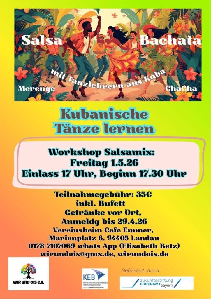 💃🌞 Salsamix Workshop – Anfänger & Mittelstufe! 🌞💃 Lust auf Bewegung, Rhythmus und echtes Miteinander? Dann seid ihr hier genau richtig! 🤗 Erlebt die Tanzform der kubanischen „Straße“, kombiniert mit modernem Salsa – voller Gefühl, Energie und Ausdruck. 👉 Für Anfänger und Mittelstufe geeignet! Grundschritte werden erklärt und begleitet – gleichzeitig gibt es spannende Kombinationen für Erfahrene. Getränke vor Ort. ⸻ 🕺 So läuft der Workshop ab: 🕺 Teil 1: ✨ 17:30– 18:30Uhr: Anfänger ✨ 18:30– 19:30 Uhr: Mittelstufe 1 ➡️ Anfänger üben gleichzeitig weiter – betreut und begleitet 🍽 Pause (ab 19:30 Uhr): 🥗 Tänzerbuffet 💬 Zeit zum Ratschen, Fragen stellen & Ausruhen 💃 Teil 2 ✨ Fortsetzung Workshop Salsa-Mix ✨ Lernen im gemeinsamen Tanz ⸻ 💃🌍 Tanz. Begegnung. Lebensfreude. Ein interkulturelles Projekt von Wir Und ois e.V. Hier geht es um mehr als nur Schritte: 👉 Rhythmusgefühl, Kultur & echtes Miteinander Freut euch auf: 🎵 Musik & Bewegung 💃 verschiedene Tanzstile 🌍 Einblicke in die kubanische Kultur 🤍 Begegnung & gemeinsames Erleben 😊 Lernen ohne Druck, für jeden ist was dabei ⸻ 📅 Freitag, 01.05.2026 ⏰ Einlass: 17:00 Uhr 📍 Ort: Vereinsheim Cafe Emmer Marienplatz 6, 94405 Landau a. d. Isar ⸻ 💶 Kosten: 35 € pro Person (inkl. Buffet) 📝 Anmeldeschluss: Mittwoch, 29.04.2026 📞 Anmeldung & Infos: 0178 7107069 (Telefon & WhatsApp) 📧 wirundois@gmx.de 🌐 www.wirundois.de ⸻ 🎤 Leitung: Onix Leticia Aigner – Tanzlehrerin mit besonderem Bezug zur kubanischen Tanzkultur 🤝 In Kooperation mit der KEB Dingolfing-Landau 💛 Gefördert durch die Bayerische Zukunft Stiftung Ehrenamt ⸻ 👉 Bewegung an. Alltag aus. Kommt vorbei und tanzt mit uns – wir freuen uns auf euch! 💃🕺 Musikalische Begleitung erfolgt ausschliesslich mit entsprechend lizenzierten oder GEMA-freien Inhalten